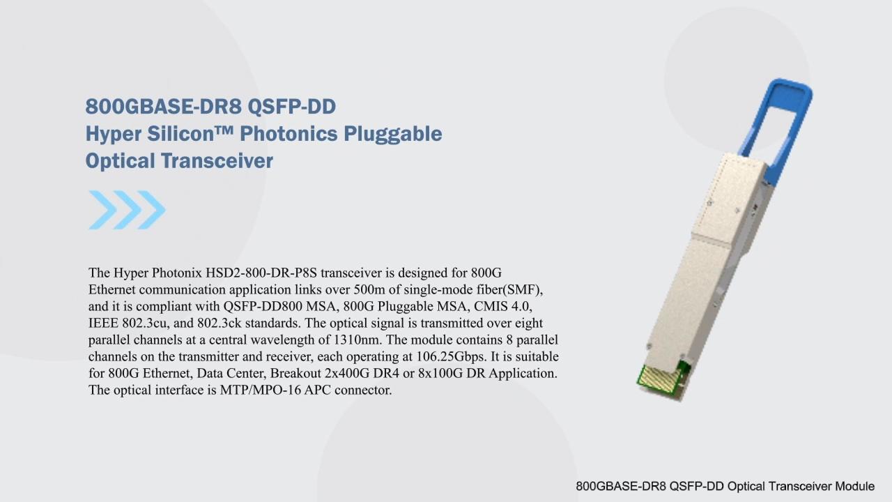 芯速联HSD2-800-DR-P8S 收发器专为 500 米单模光纤(SMF)上的 800G 以太网通信应用链路而设计,符合 QSFP-DD 800 MSA、800G Pluggable MSA、CMIS 4.0、IEEE 802.3cu 和 802.3ck 标准。光信号在中心波长为 1310nm 的 8 个并行通道上传输。该模块在发射器和接收器上包含 8 个并行通道,每个通道的工作速率为 106.25Gbps。它适用于 800G 以太网、数据中心、突破性 2x400G DR4 或 8x100G DR 应用。光接口为 MTP/MPO-16 APC 连接器。